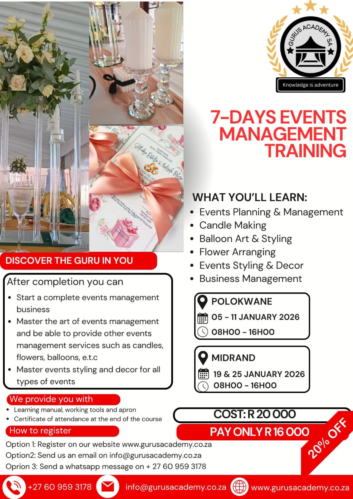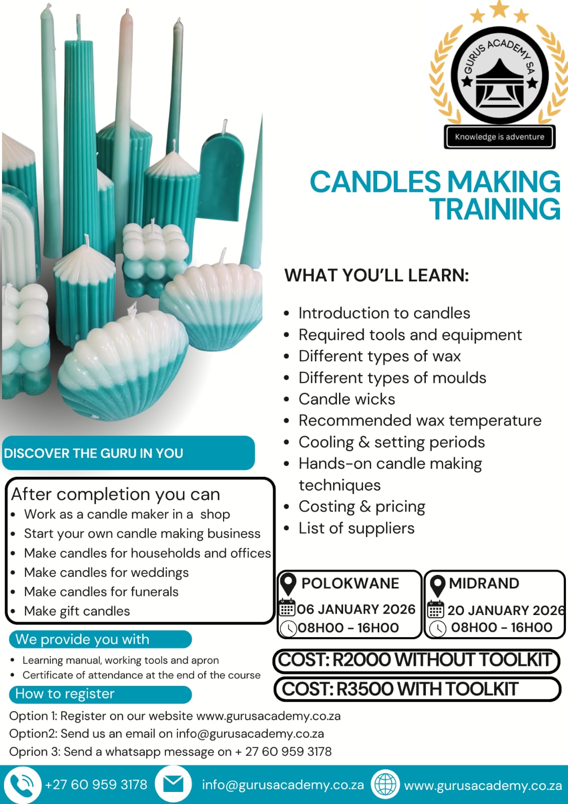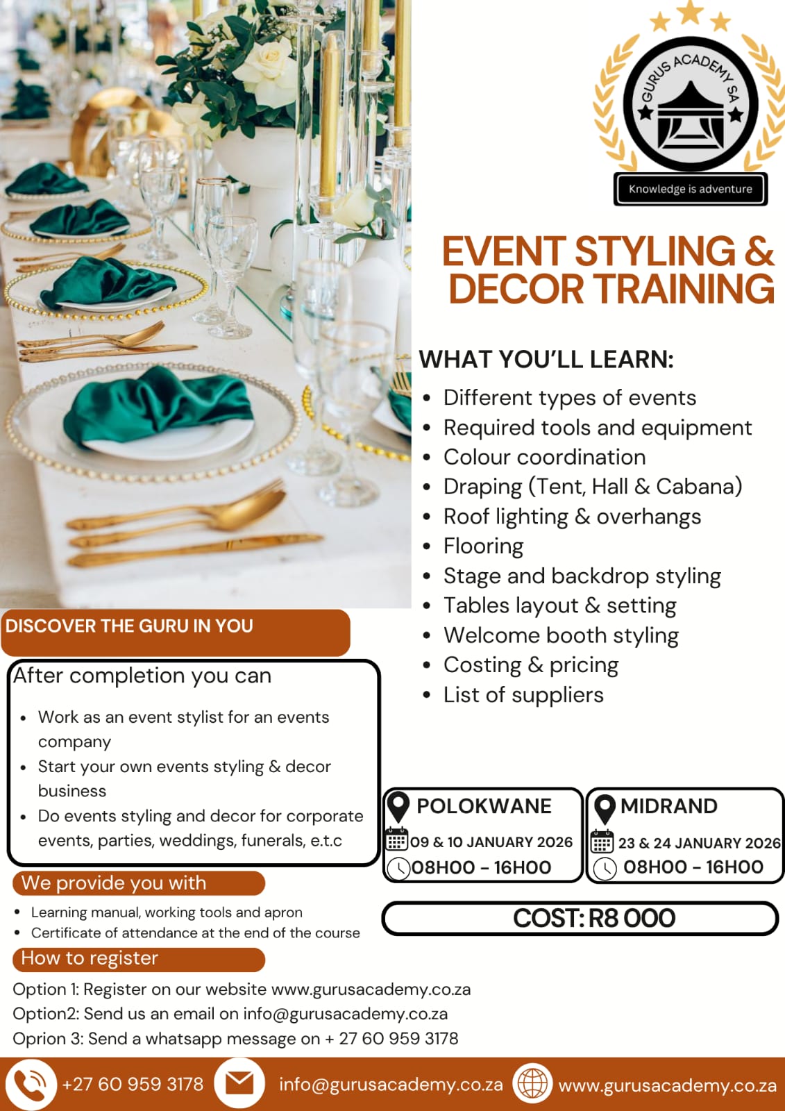 At Gurus Academy SA, we equip aspiring and existing event entrepreneurs with both theoretical knowledge and hands-on skills. Our training programmes are designed to be practical, empowering, and industry-relevant. Whether you’re interested in planning, styling, candle making, or business management, we have the right course for you. Learn from industry professionals, gain confidence, and turn your passion into a profitable business.