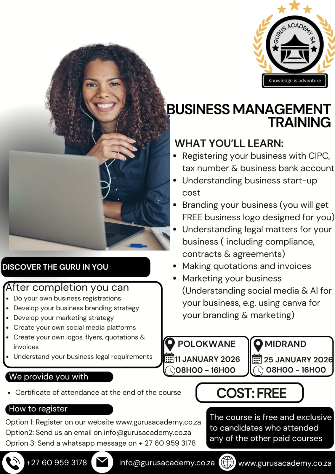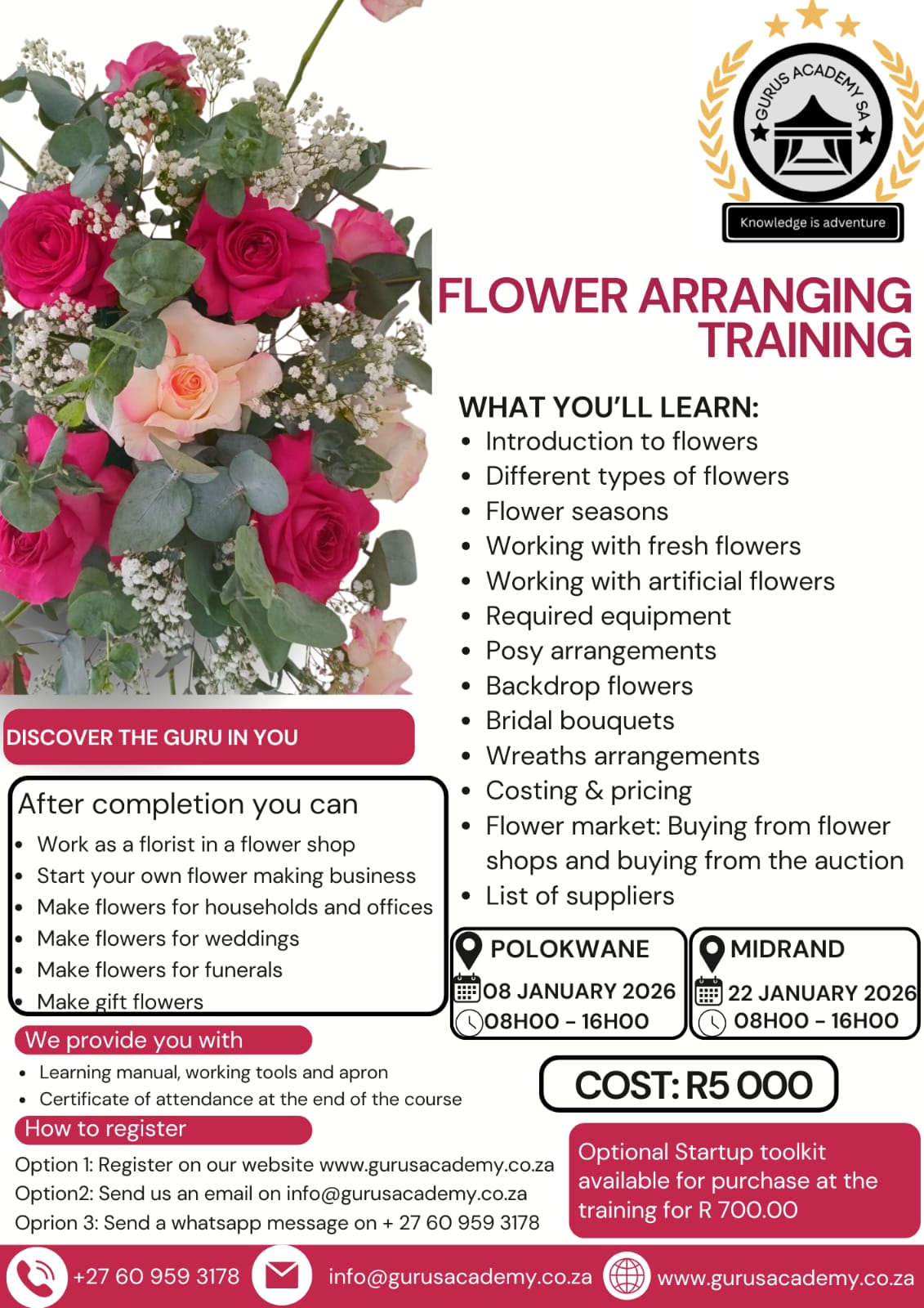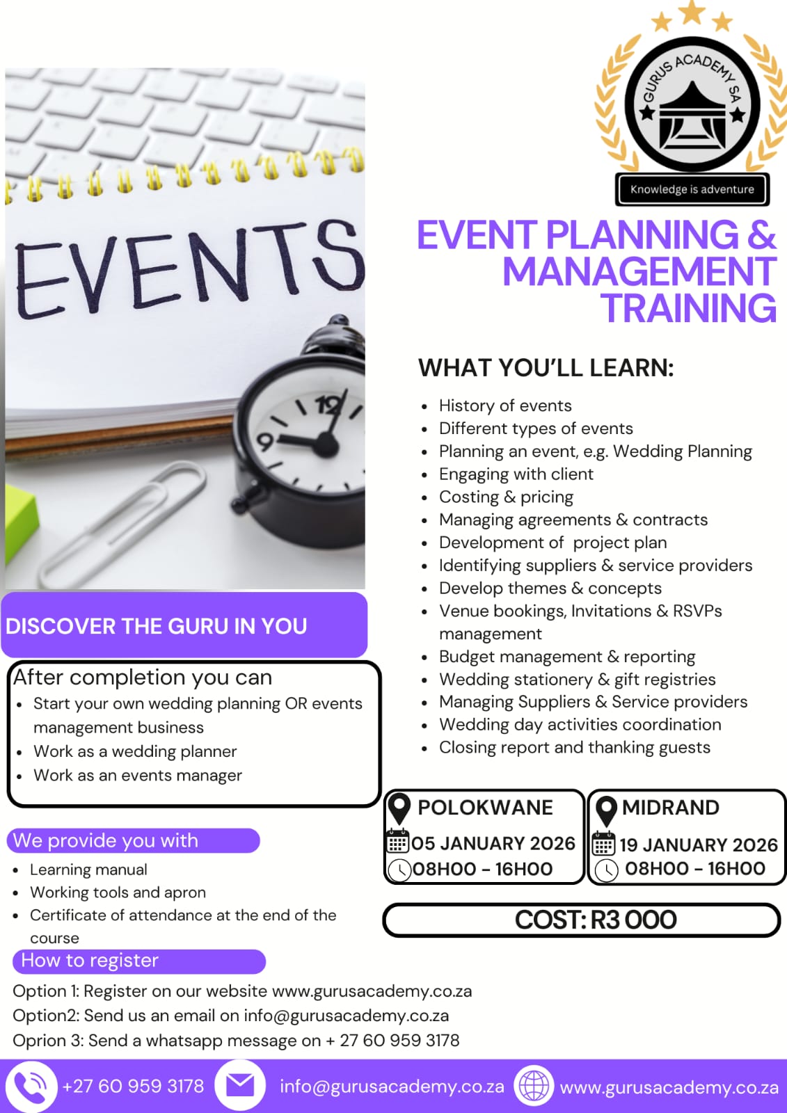 At Gurus Academy SA, we equip aspiring and existing event entrepreneurs with both theoretical knowledge and hands-on skills. Our training programmes are designed to be practical, empowering, and industry-relevant. Whether you’re interested in planning, styling, candle making, or business management, we have the right course for you. Learn from industry professionals, gain confidence, and turn your passion into a profitable business.