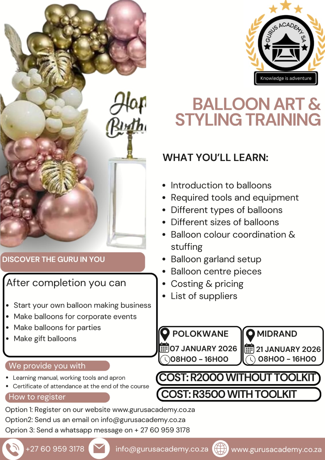 🟢 Training + Starter Kit – R3,000 ( 3 x 100 x 12” balloons, 2 x 5” balloons,1 x electric pump, 1 x hand pump)